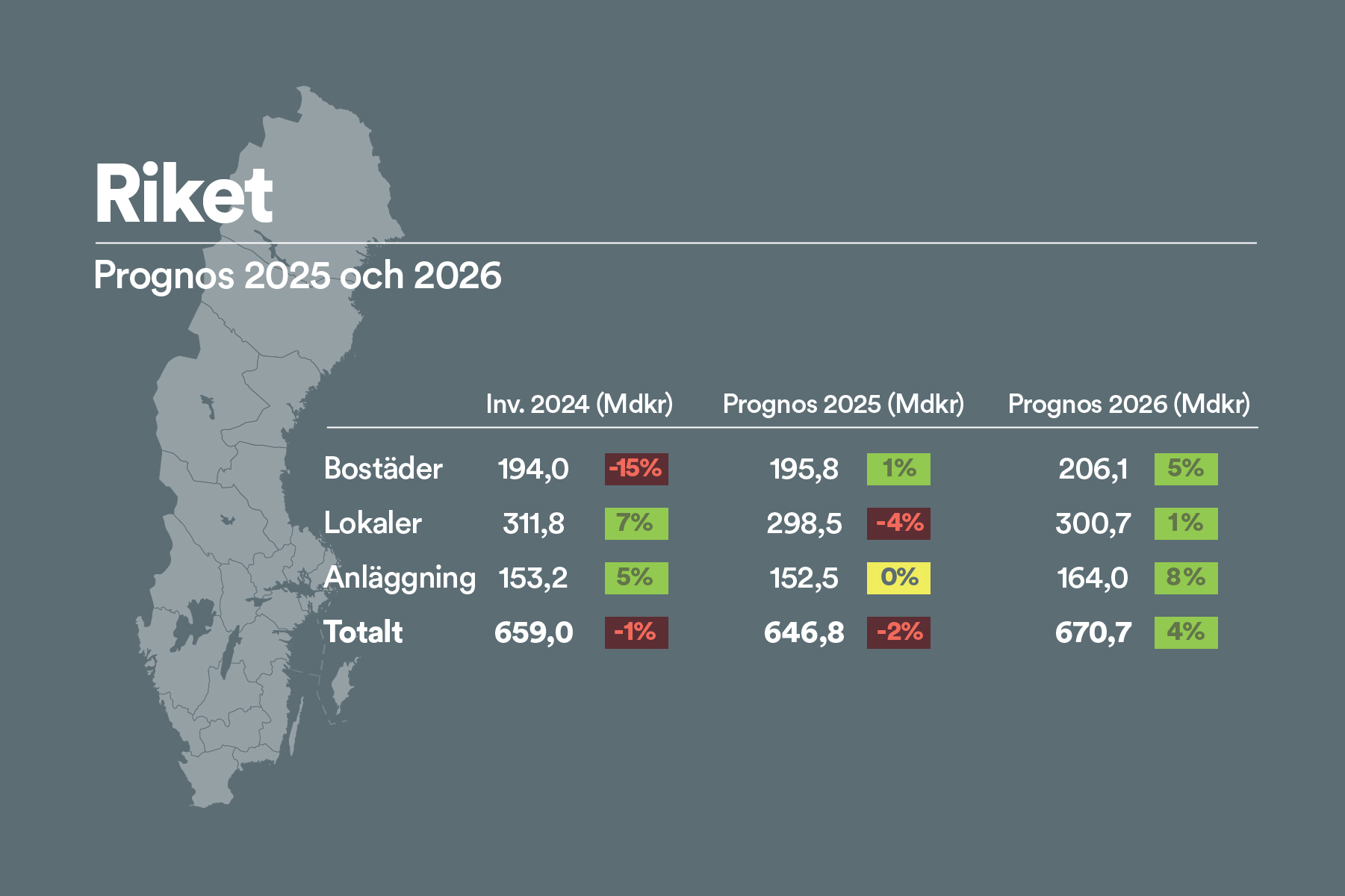 Sammantaget ökar investeringarna i bostäder, lokaler och anläggningar med knappt två procent över prognosperioden – till 670,7 miljarder kronor 2026. Sysselsättningen inom bygg- och anläggning stiger med 1 200 personer till 369 500.