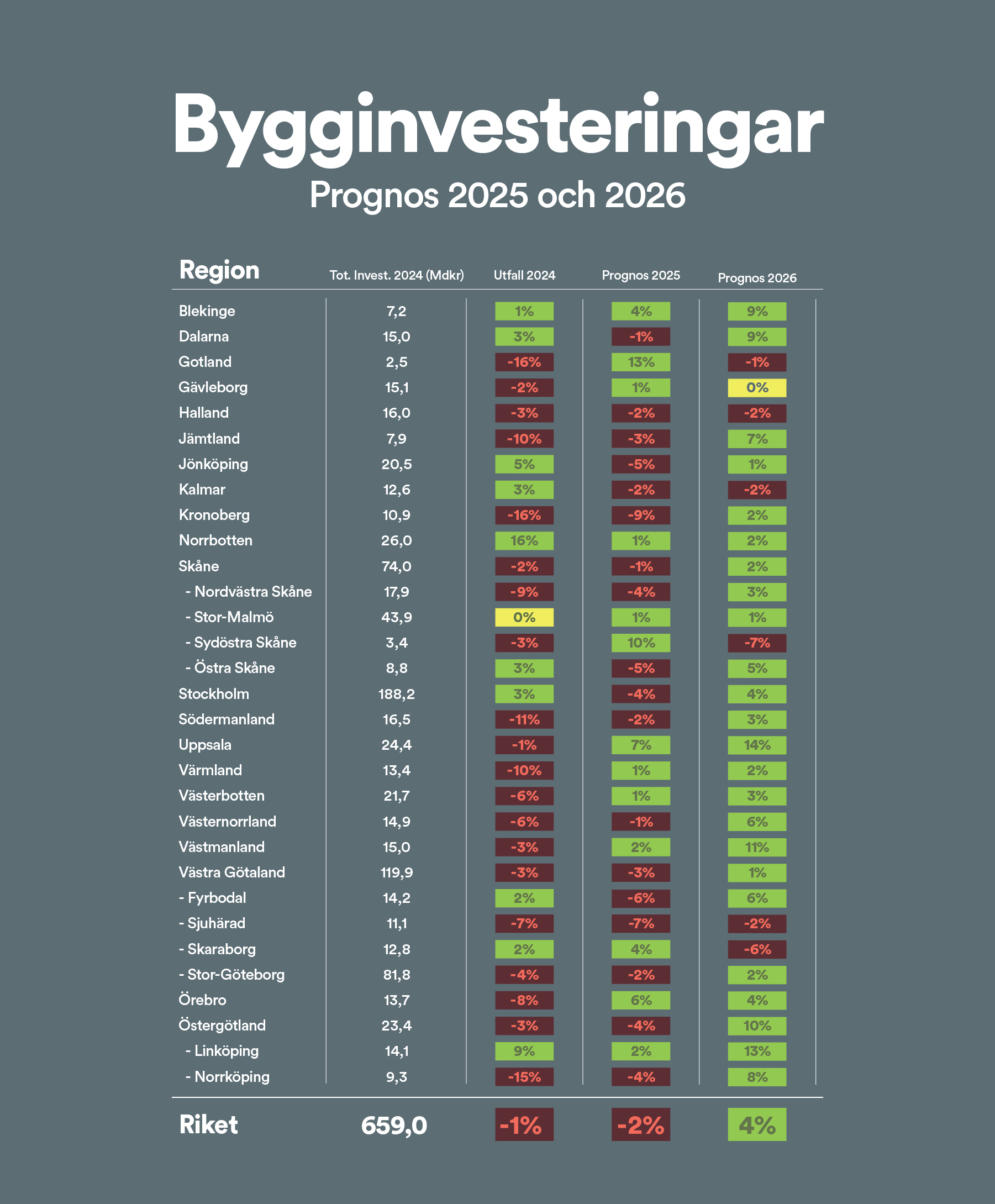Bygginvesteringarna i bostäder, lokaler och anläggningar ökar med två procent under prognosperioden 2025-2026. Regioner med koppling till beredskap och försvar driver återhämtningen.
