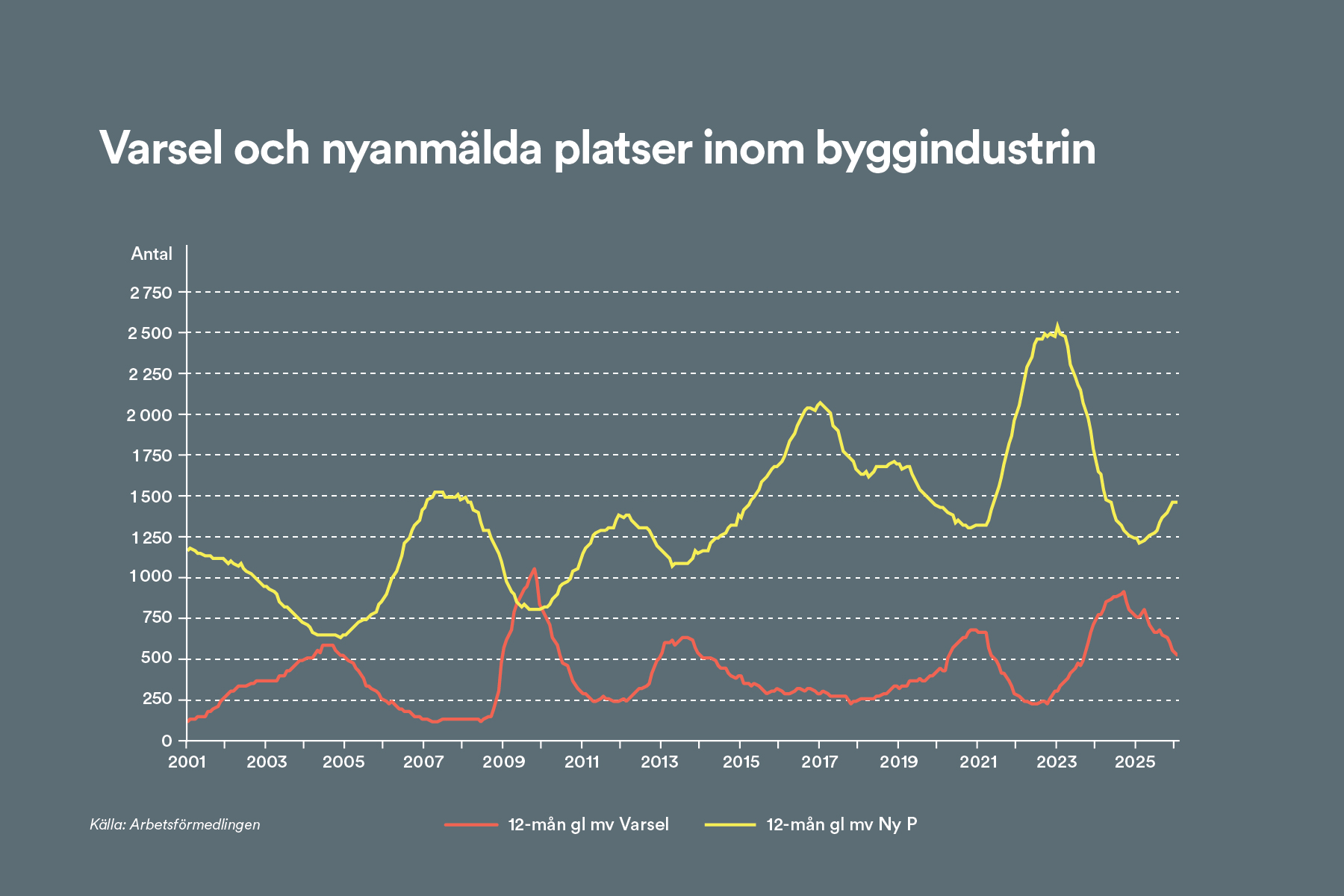 Vidare fortsatte antalet nyanmälda platser till Arbetsförmedlingen att öka med 26 procent i årstakt under fjärde kvartalet. Totalt nyanmäldes 4 243 platser inom byggsektorn under sista kvartalet i fjol.