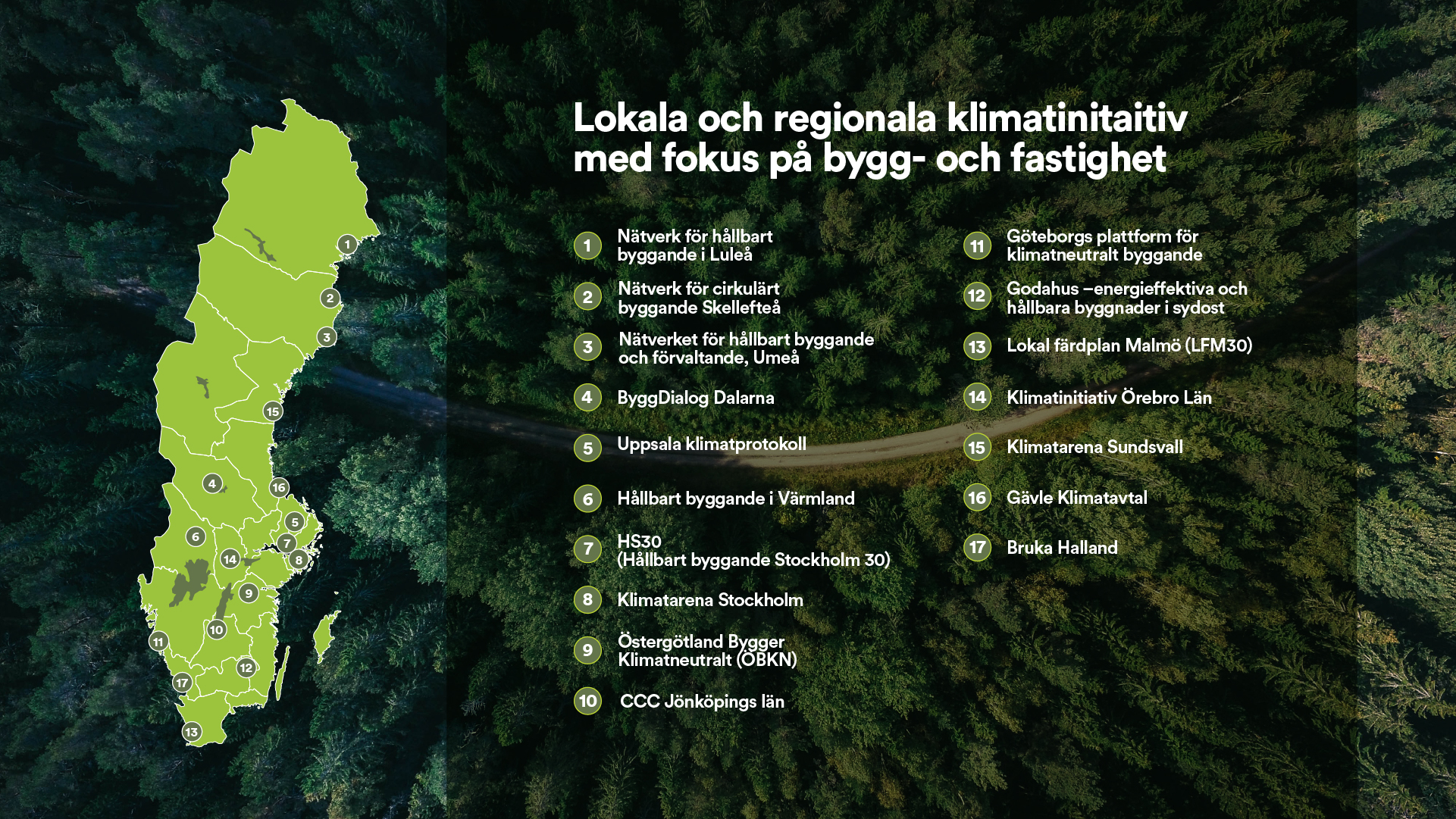 Runt om i landet sjuder det av engagemang och framdrift för att reducera utsläppen från samhällsbyggnadssektorn. På flera ställen har näringslivet, offentliga aktörer och akademin gått ihop för att kraftsamla lokalt och regionalt. Dessa klimatinitiativ är en stor och viktig kraft för att minska bygg- och anläggningssektorns klimatutsläpp.
